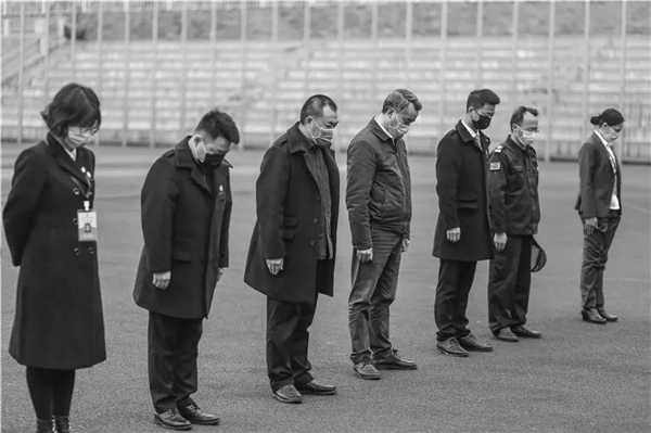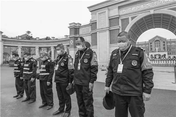 “嗚……嗚……”上午10時(shí),防空警報(bào)拉響,鮮艷的五星紅旗緩緩下降至距離旗桿1/3的位置,堅(jiān)守崗位的天府航院值班教職工聚集在國(guó)旗下,神情凝重,默然肅立,為犧牲的烈士和逝世同胞默哀3分鐘。這一刻時(shí)間靜止,這一刻舉國(guó)同悲!為逝者哀悼,向犧牲的英雄致敬。