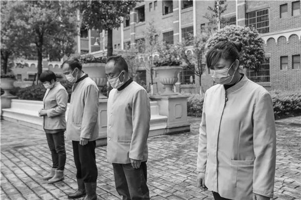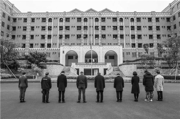 教職工們眼眶泛紅,沉默良久,“疫情新聞不敢過多地看,因?yàn)榭匆淮慰抟淮巍!彼麄冊(cè)谄鞐U前雙手合十祈禱,有人在旗桿前鞠躬。