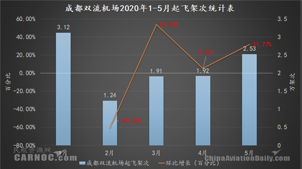 圖:成都雙流機場2020年1-5月飛機起飛架次統(tǒng)計表