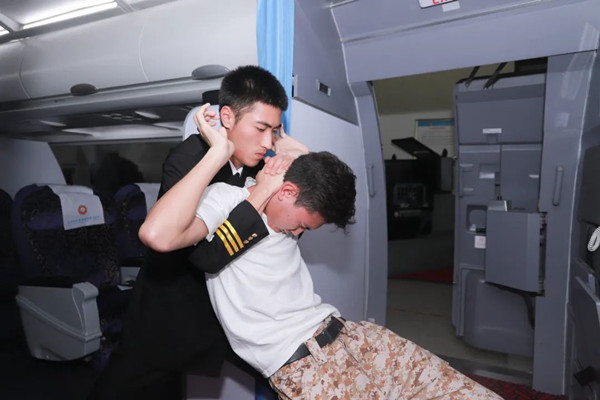 當(dāng)歹徒?jīng)_擊駕駛艙,我們可以利用歹徒背對我們的條件,進行制服。