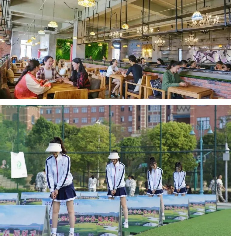 校園內(nèi)娛樂設(shè)施齊全:電子閱覽室、夢想花園、臺球室、桌游館、籃球場、高爾夫球場等。