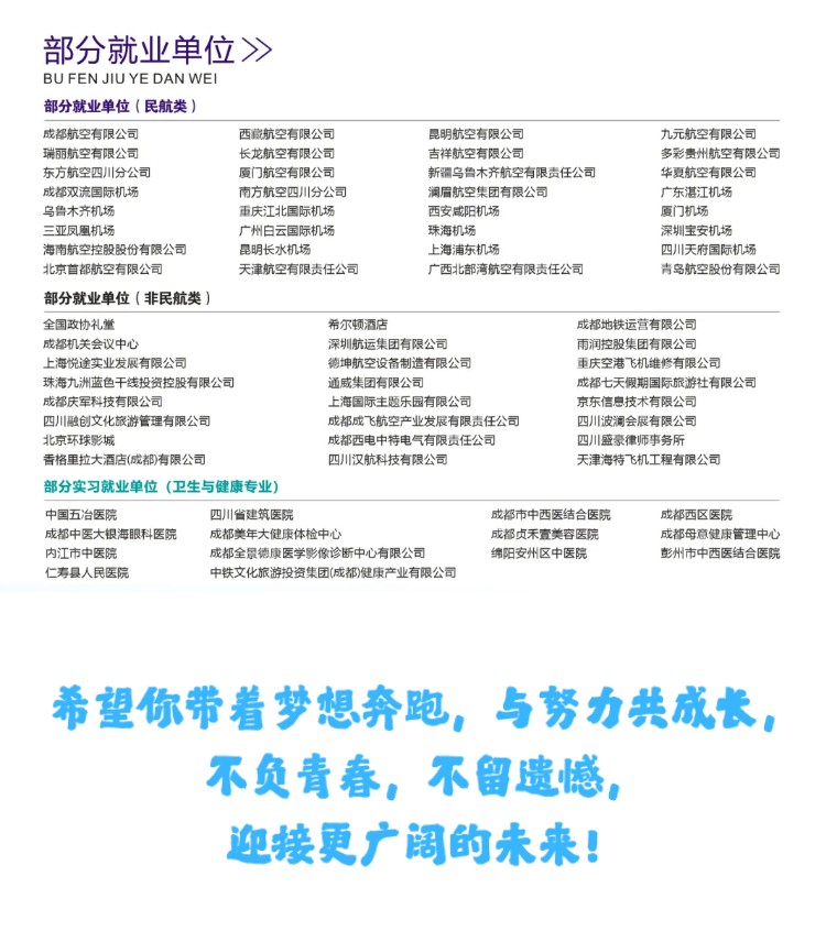 學(xué)校高度重視學(xué)生就業(yè)工作,與國內(nèi)外眾多航空公司、機(jī)場、旅行社、大型酒店、公立醫(yī)院、互聯(lián)網(wǎng)企業(yè)、律師事務(wù)所及其他優(yōu)質(zhì)企事業(yè)單位建立了長期合作關(guān)系。入學(xué)簽訂《教育與就業(yè)合同》,畢業(yè)提供2年就業(yè)跟蹤服務(wù),就業(yè)率常年保持在98%以上,實現(xiàn)了高層次、高品質(zhì)、高薪資就業(yè),畢業(yè)生身影遍布全國各地。