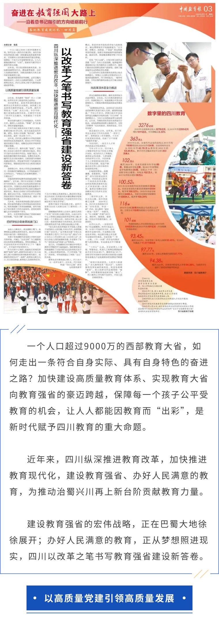 加強(qiáng)黨的領(lǐng)導(dǎo)是教育高質(zhì)量發(fā)展的“定海神針”。近年來,四川針對黨建工作薄弱環(huán)節(jié)持續(xù)發(fā)力:連續(xù)5年印發(fā)高校黨建年度重點(diǎn)任務(wù),實(shí)施民辦高校黨建質(zhì)量提升計(jì)劃,實(shí)現(xiàn)民辦高校黨組織書記選派全覆蓋并逐步優(yōu)化,推動(dòng)公辦高校與民辦高校黨建共建;截至2023年底,完成8755所中小學(xué)校黨組織領(lǐng)導(dǎo)下的校長負(fù)責(zé)制改革,提前1年完成整省改革任務(wù)。
