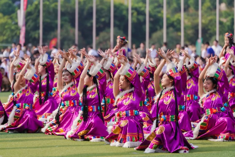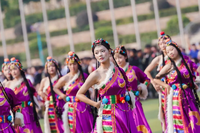 伴隨著悠揚的藏族音樂,舞者們身著絢麗的民族服飾,輕盈地踏著節(jié)奏,仿佛將觀眾帶入了青藏高原的遼闊天地。她們的動作時而柔美,時而鏗鏘,展現了藏族人民聚在一起時的歡樂與豪情。舞臺上的色彩與韻律交織,歡快的氣氛瞬間感染了全場,觀眾仿佛也被這歡樂的場景所感染,心隨舞動。