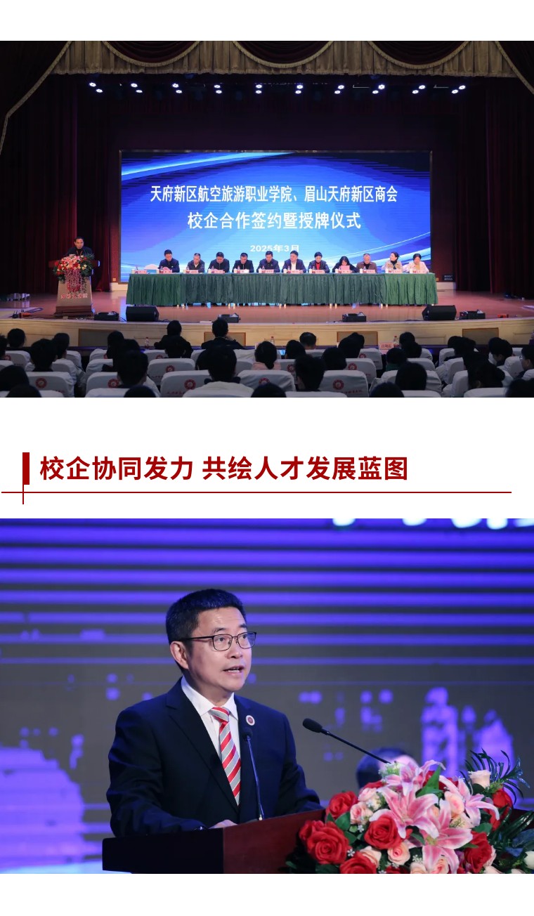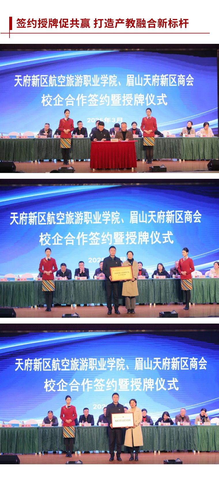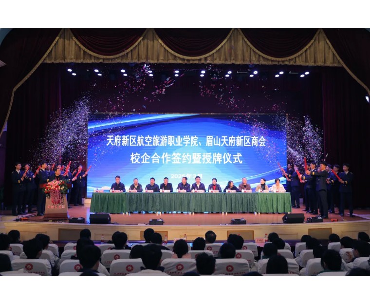 3月11日,天府新區(qū)航空旅游職業(yè)學(xué)院與眉山天府新區(qū)商會(huì)舉行校企合作簽約暨授牌儀式。眉山市人大常委會(huì)副主任、天府新區(qū)眉山黨工委常務(wù)副書記廖仁軍,眉山市委統(tǒng)戰(zhàn)部副部長(zhǎng)、市工商聯(lián)黨組書記何建瓊,眉山天府新區(qū)一級(jí)調(diào)研員陳青松,眉山市工商聯(lián)黨組成員、副主席劉前線,天府新區(qū)眉山黨工委黨群工作部副部長(zhǎng)潘燕,天府新區(qū)眉山黨工委黨群工作部副部長(zhǎng)王冰,眉山天府新區(qū)商會(huì)會(huì)長(zhǎng)范松如,四川新達(dá)粘膠科技有限公司總經(jīng)理郭明高,四川五洲仁信科技有限公司總經(jīng)理鄧永紅,四川厚天科技股份有限公司總經(jīng)理蔡敏,四川東星航空教育集團(tuán)董事長(zhǎng)、天府新區(qū)航空旅游職業(yè)學(xué)院總督學(xué)辜英智,天府新區(qū)航空旅游職業(yè)學(xué)院院長(zhǎng)劉陽等學(xué)校相關(guān)領(lǐng)導(dǎo)及師生代表共同見證這一重要時(shí)刻。