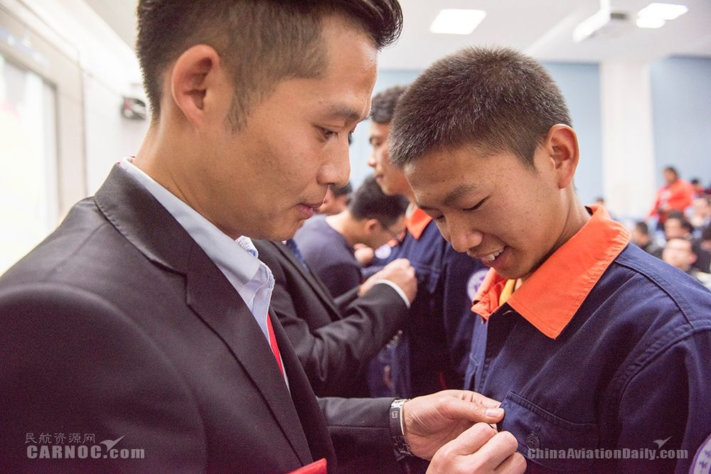 圖:師傅給學(xué)員佩戴工匠精神胸牌
