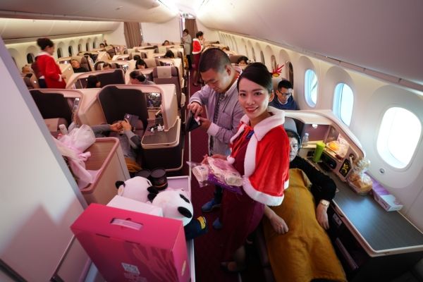 特別的是,飛往三亞的HO1225的航班號正巧與圣誕節(jié)的日期相同。為此全體乘務組提前策劃、精心準備,著力打造圣誕主題航班。除了“金燦燦”的圣誕版首航蛋糕外,吉祥航空為每位頭等艙旅客準備了精致的杯子蛋糕;同時在客艙中布置了圣誕賀卡和吉祥熊貓玩偶,增添圣誕氣氛。乘務員則穿上圣誕裝扮,給旅客送來圣誕驚喜。另外,吉祥航空精心裝飾了虹橋機場的值機柜臺,開展圣誕集市活動,現(xiàn)場派發(fā)圣誕小食與精美禮品,為旅客送上圣誕與新年祝愿。