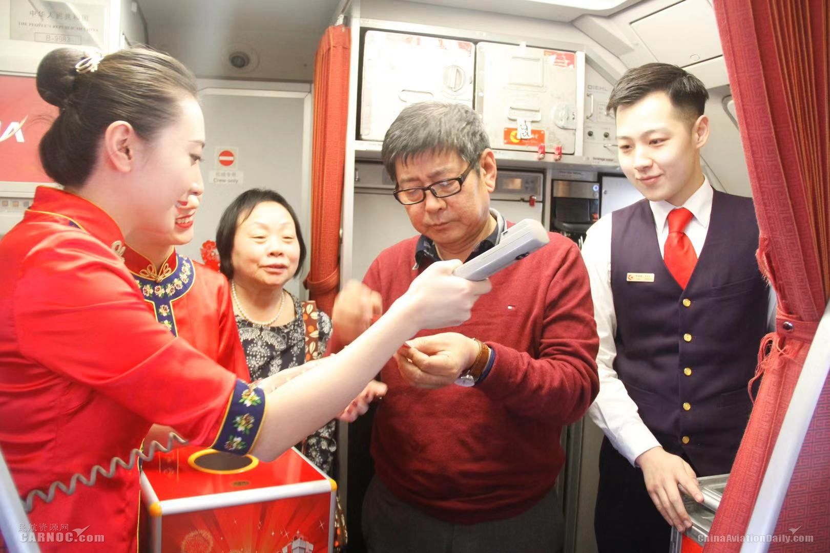 飛機(jī)進(jìn)入平飛后,乘務(wù)員來到客艙里,向大家送出了元宵節(jié)的祝福,同時邀請了一名熱情的旅客來到客艙中部,用隨身攜帶的吉他為乘務(wù)員和旅客伴奏,一起唱響《我和我的祖國》,大家紛紛揮舞起手中的小紅旗,客艙中洋溢著節(jié)日的喜悅。在隨后的抽獎環(huán)節(jié)中,為展現(xiàn)天津特色,天津航空精心準(zhǔn)備了泥人張。來自天津的旅客高先生幸運地抽中了泥人張,他說:“能坐上自己家鄉(xiāng)主題的彩繪飛機(jī)感覺挺自豪的,這些禮物我們都很喜歡,希望家鄉(xiāng)越來越好,越來越多的人能了解天津,來天津旅游!”
