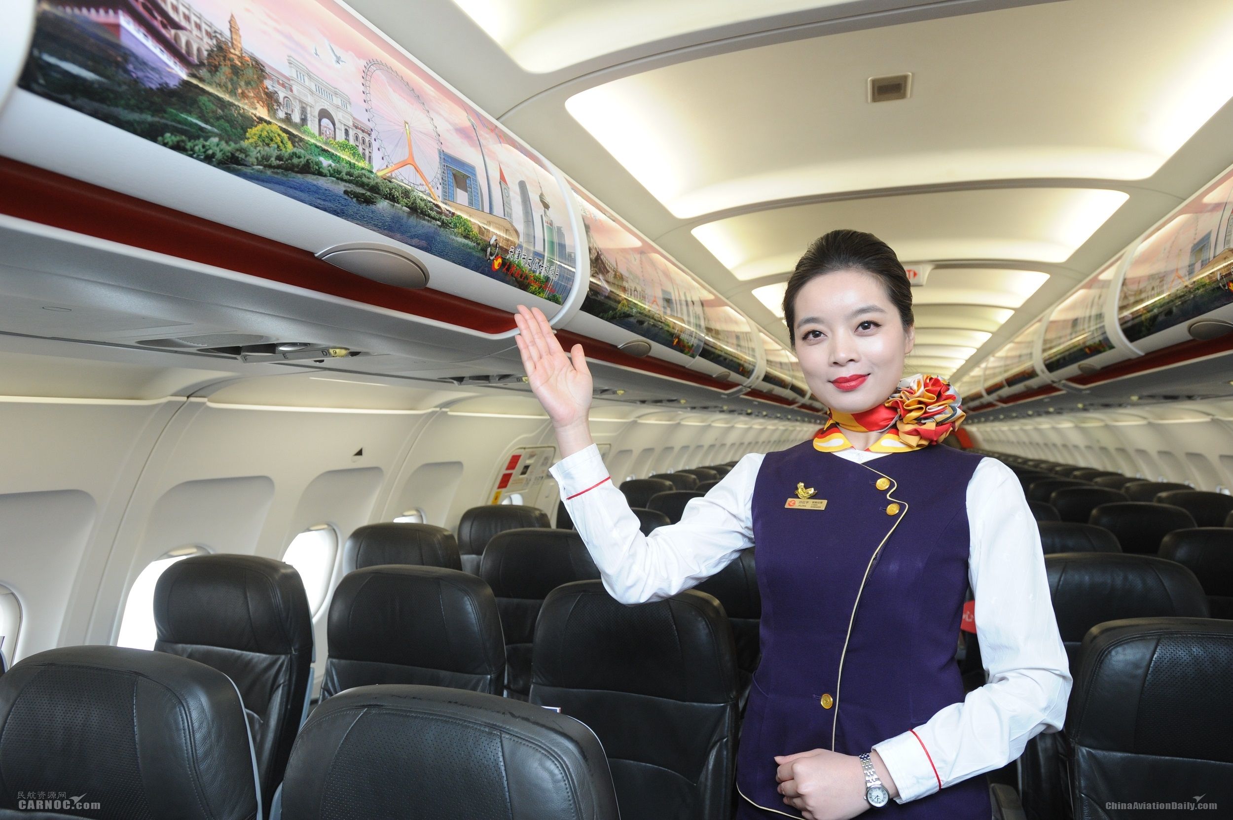 乘務(wù)長孫婕通過廣播向大家介紹了此次客艙活動以及機(jī)身涂裝設(shè)計理念:“此架彩繪飛機(jī)的機(jī)身設(shè)計靈感來源于天津的地標(biāo)性建筑--津門津塔和天津之眼,通過手繪的方式將上述景致錯落排布。機(jī)身涂裝還引入天津市行政區(qū)規(guī)劃圖、天津城市旅游宣傳口號”天天樂道o津津有味“以及海河波浪等天津本地特色設(shè)計元素,配合天津旅游的紅綠藍(lán)三種品牌色彩,強(qiáng)化天津市旅游局的品牌屬性,從而更好的推廣天津旅游,傳播天津文化?!?/p>