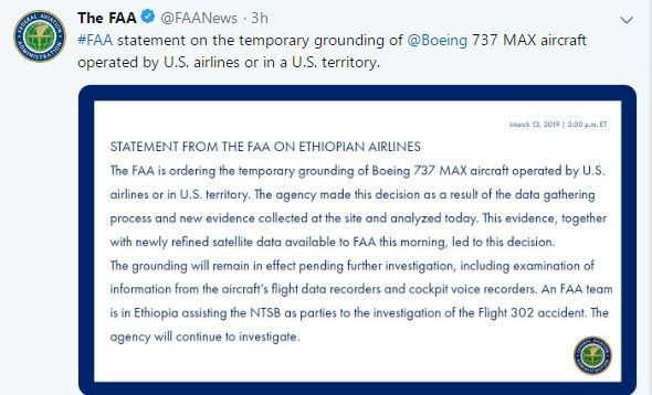 波音同樣于當(dāng)日發(fā)布了一份支持臨時(shí)停飛737 MAX運(yùn)營(yíng)的聲明。