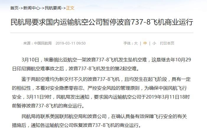 3月11日上午9時(shí),中國(guó)民航局在全球率先發(fā)布“停飛令”:鑒于兩起空難均為新交付不久的波音737-8飛機(jī),且均發(fā)生在起飛階段,具有一定的相似性,本著對(duì)安全隱患零容忍、嚴(yán)控安全風(fēng)險(xiǎn)的管理原則,為確保中國(guó)民航飛行安全,要求國(guó)內(nèi)運(yùn)輸航空公司于2019年3月11日18時(shí)前暫停波音737-8飛機(jī)的商業(yè)運(yùn)行。