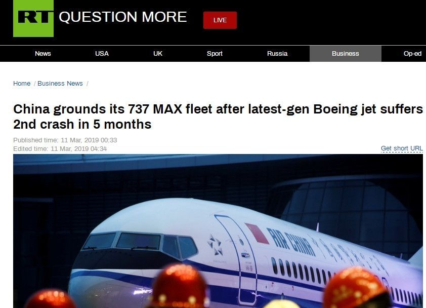 今日俄羅斯報(bào)道——5個(gè)月來(lái)最新一代波音飛機(jī)第二次墜毀之后,中國(guó)停飛其737 MAX機(jī)隊(duì)
