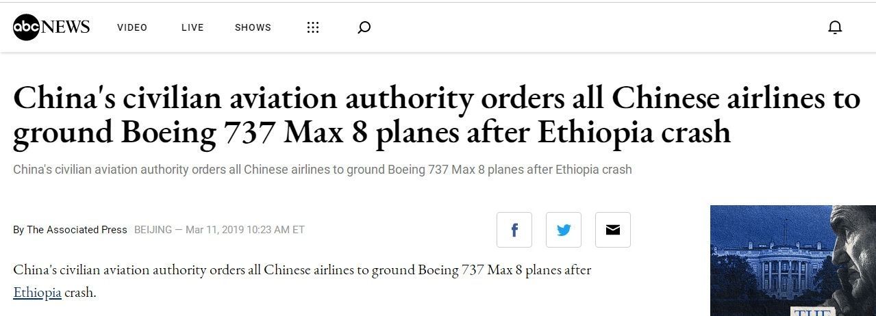 美國(guó)ABC報(bào)道——在埃塞俄比亞墜機(jī)事件之后,中國(guó)民航局命令所有中國(guó)航司停飛波音737 MAX 8飛機(jī)