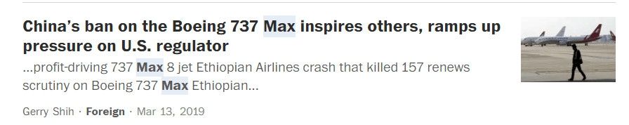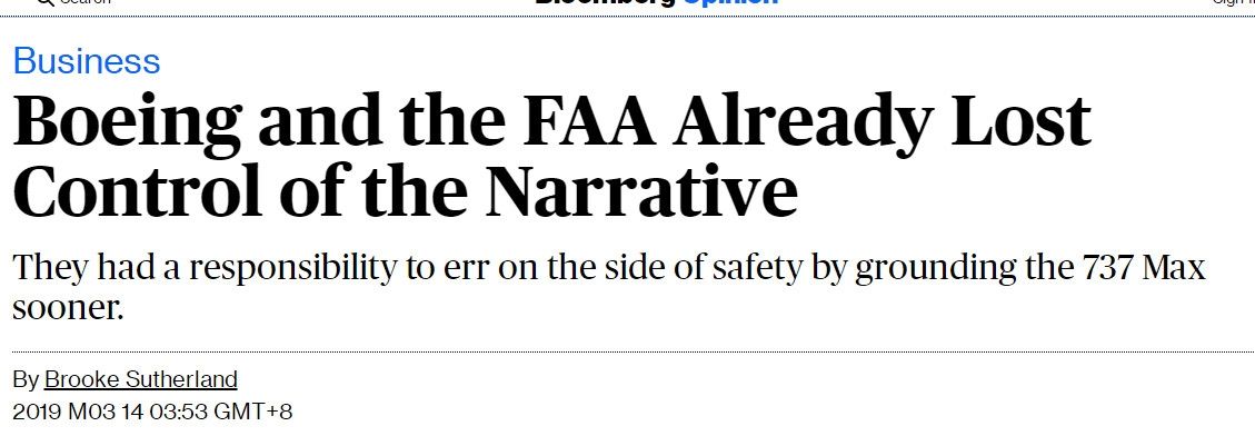 彭博社Brooke Sutherland發(fā)表評(píng)論文章稱,波音與FAA已經(jīng)丟失了話語(yǔ)權(quán)。波音與FAA本應(yīng)早點(diǎn)采取更加保守的方式,但它們現(xiàn)在才以安全為先,這不能為它們之前的猶豫脫責(zé)。全球各國(guó)紛紛跟進(jìn)領(lǐng)先者——中國(guó),停飛737 MAX的做法,這損害了波音與FAA的可信度,并讓它們?cè)趹?yīng)對(duì)這一危機(jī)時(shí)處于被動(dòng)防御地位。